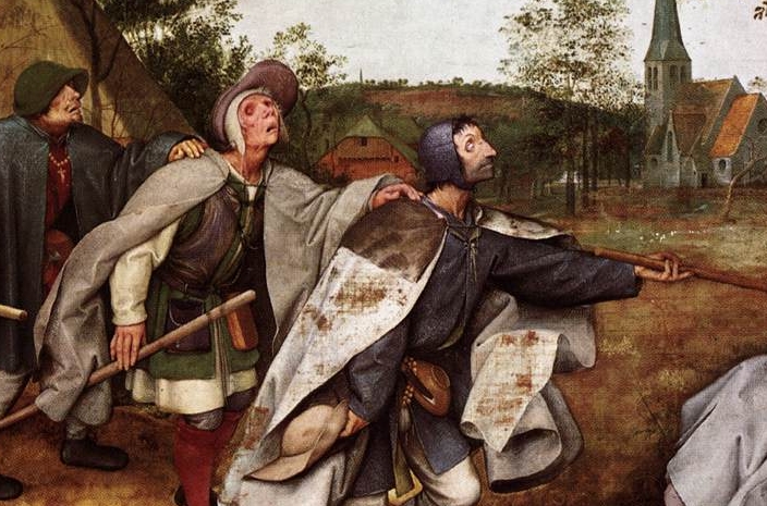 Du côté des forces de l’ordre, la scénarisation des tableaux successifs est très marquée. Les petits hommes en noir avancent en groupes serrés, courent parfois par deux, celui de derrière une main sur l’épaule de l’autre qui précède, comme les aveugles de Brueghel, et toujours très entourés, au coude à coude.